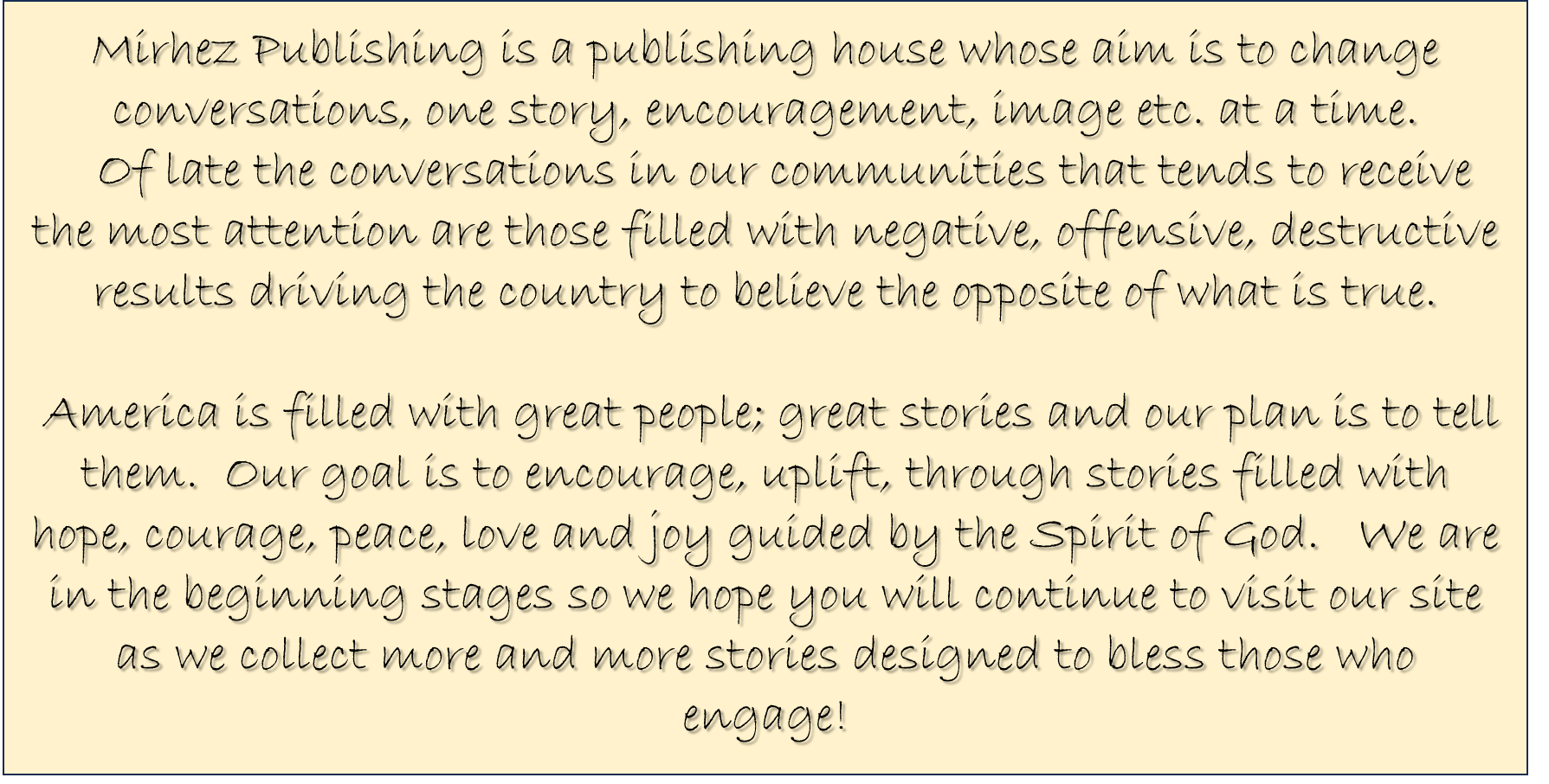 Mirhez Publishing is a publishing house whose aim is to change the conversation, one story, encouragement, image etc. at a time.